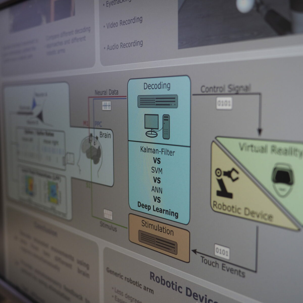 Um gelähmten Patienten zu helfen und ihnen ein selbstständigeres Leben zu ermöglichen, entwickeln wir zurzeit in unserer Forschungsgruppe fortschrittliche und wegweisende Neuroprothesen. Dazu nutzen wir einen hochgradig interdisziplinären Ansatz, bei dem die Neurowissenschaften, Neurochirurgie, maschinelles Lernen und virtuelle Realität ineinander greifen. Wir nutzen unsere Expertise in diesen Gebieten, um sogenannte ‚brain-computer interfaces‘ (BCI) zu entwickeln. Bei einem BCI handelt es sich um ein System, dass die direkte Kommunikation zwischen Gehirn und Computern ermöglicht und dabei unter anderem eine geschädigte Wirbelsäule überbrücken kann. Neuronale Signale werden dabei aus dem Gehirn ‚ausgelesen‘ und die Bewegungsintentionen des Patienten mit Hilfe einer speziellen Software dekodiert. Diese entschlüsselten Bewegungsintentionen werden dann benutzt, um Prothesen anzusteuern. Damit wird es gelähmten Patienten wieder möglich sein, Selbständigkeit zurückzugewinnen und damit ihre Lebensqualität deutlich zu verbessern.